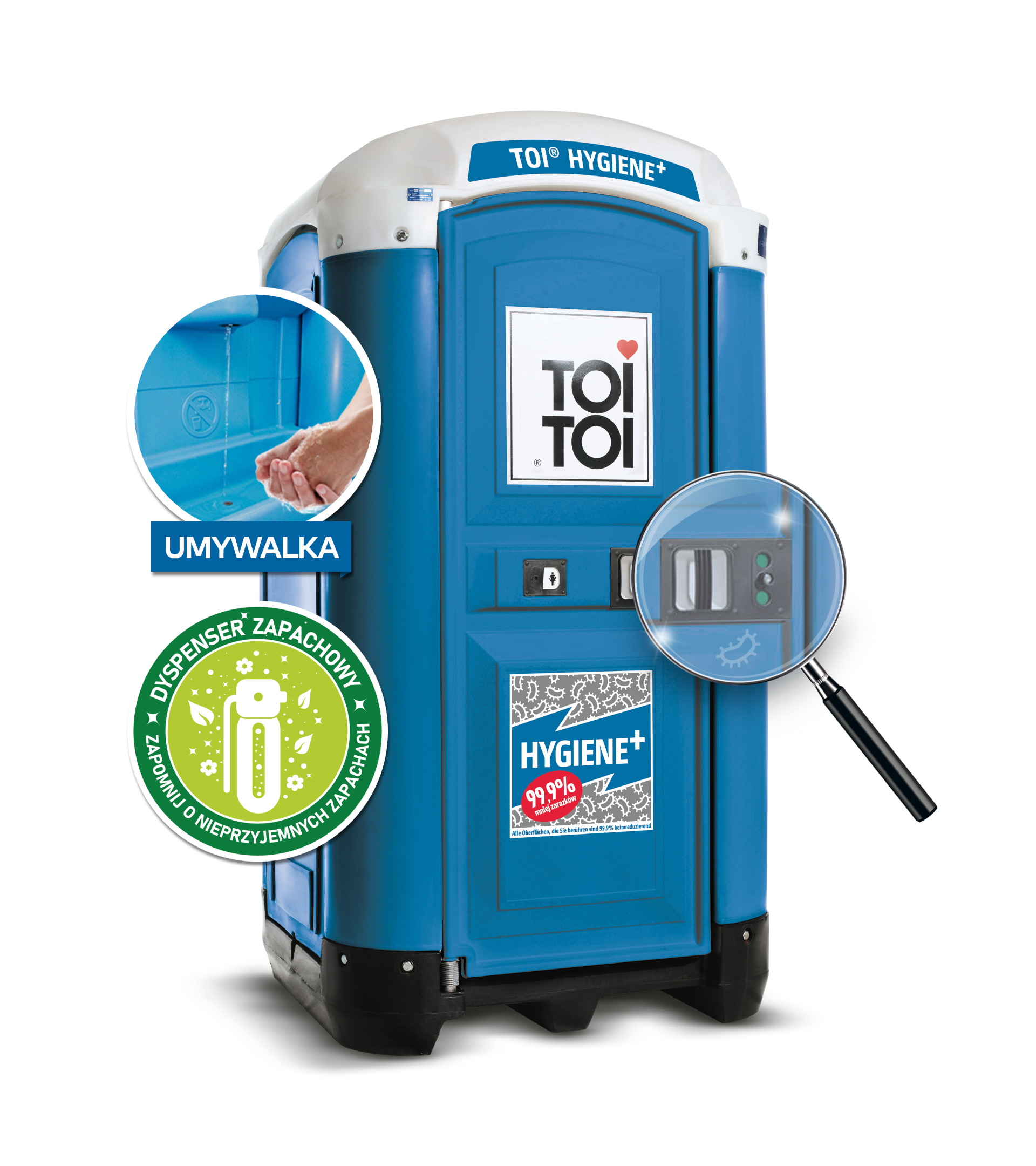 Wszystkie powierzchnie stykowe dotykane przez gości TOI TOI® Hygiene+ są pokryte dodatkami antybakteryjnymi – łącznie z drzwiami, klamką, dozownikiem i oczywiście deską sedesową. TOI TOI® Hygiene+ zachwyca także bogatym wyposażeniem, w którym oprócz toalety i pisuaru znajduje się wyjątkowo duża umywalka, w której można umyć całe przedramię. W kabinie znajduje się także 60-litrowy zbiornik na wodę sterowany pompką nożną, dozownik mydła i ręczników papierowych oraz dozownik środka do dezynfekcji rąk. Innowacyjna technologia TOI® Hygiene+ łączy w ten sposób profilaktykę zdrowotną i nowoczesne standardy higieny z dużym komfortem.